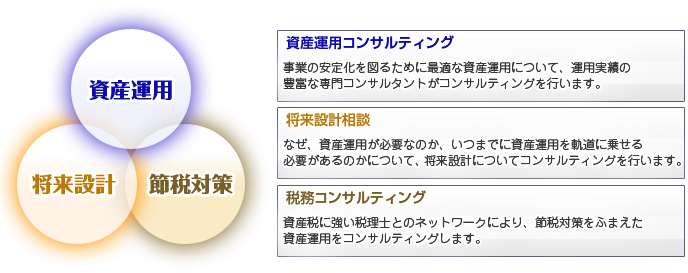 これからの日本は少子・高齢化社会を迎え、日本経済は不透明な時代になっていくなかで、資産運用により事業の安定化を図りたい経営者に役立つコンサルティングを行いたいという代表の思いからアセットライフマネジメントは発足しました。資産運用を検討する経営者と同じ目線で問題を解決することをできるコンサルタントはほとんどいません。したがって、アセットライフマネジメントは日本の経営者のためのコンサルティング会社として全力でサポートすることができます。